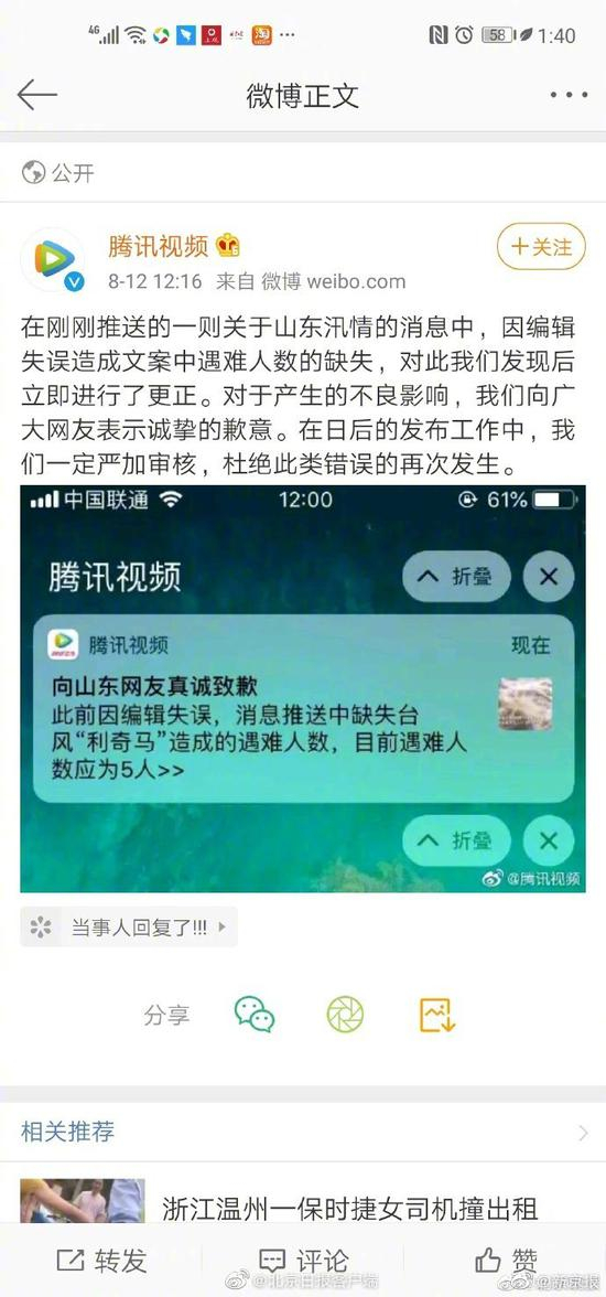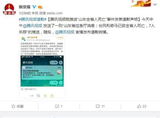 今天中午@腾讯视频 发送了一则“山东省应急厅消息:台风利奇马已致全省人死亡,7人失踪”的推送,随后,@腾讯视频 官博发布道歉微博。