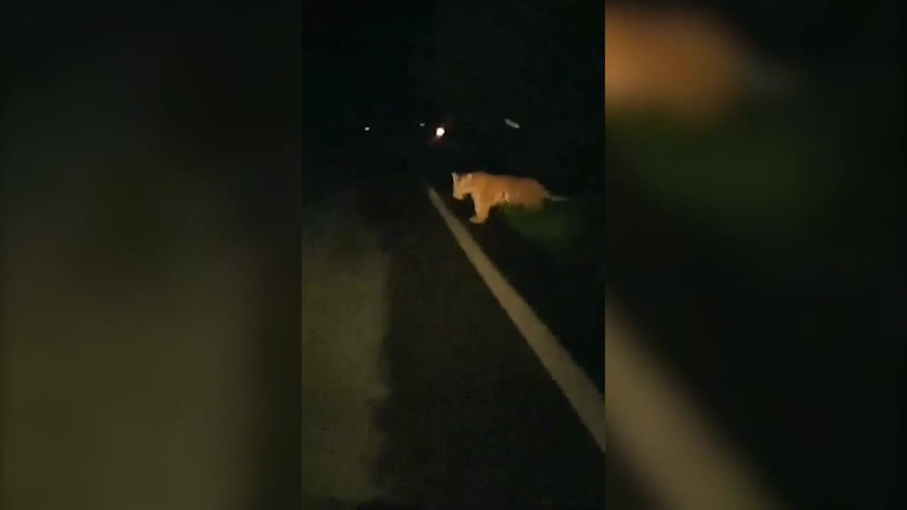 视频中显示,一辆出租车行驶在公路上时,路边出现了一只东北虎,经过短暂对视后,这只东北虎穿过马路自行离开。