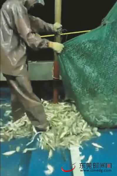 ▲8月18日凌晨,粤东莞渔61018号渔船下网,首网捕鱼近千斤