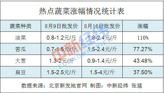 另据北京新发地官网数据显示,8月16日,北京新发地市场油菜的批发价是1.8-2.4元/斤,比8月9日的0.80-1.20元/斤上涨110%。