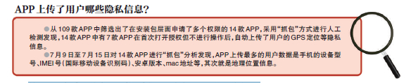 嘀嗒出行、百合婚恋、和包支付、瑞钱包、e代驾、悟空理财等10个APP安装包申请了全部6项敏感权限;作业帮、中兴智能家居、宜人贷、红包锁屏等7款APP“自动”上传用户位置信息。