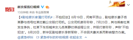 [副检察长家属打司机:不怕犯法]8月19日,河南平顶山,副检察长妻子岳某静与岳母杜某拦截公交殴打司机。公交司机娄珍珍称,7月23日,其与乘客杜某发生争执,杜某下车后喊来女儿岳某静拦停返程公交,并殴打娄珍珍,声称“不怕犯法”。8月20日,新华区副检察长李新军称,不会因夫妻关系而影响警方办案。