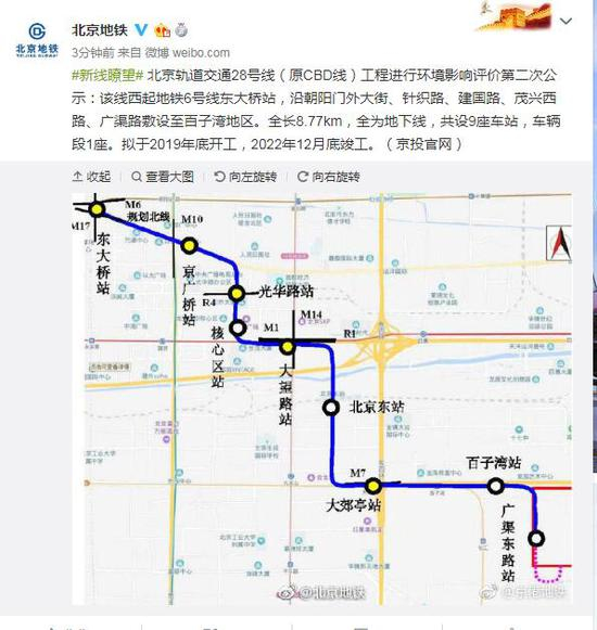 北京轨道交通28号线(原CBD线)工程进行环境影响评价第二次公示:该线西起地铁6号线东大桥站,沿朝阳门外大街、针织路、建国路、茂兴西路、广渠路敷设至百子湾地区。全长8.77km,全为地下线,共设9座车站,车辆段1座。拟于2019年底开工,2022年12月底竣工。(京投官网)