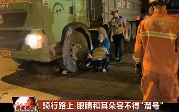 【浙江杭州】小伙骑车卷入工程车 耳朵里塞着耳机