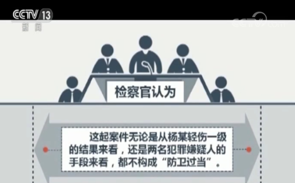 检察官 周宇:在第二个阶段,虽然造成杨某轻伤一级的后果,但杨某的行为是一种不法侵害,两名犯罪嫌疑人的行为属于正当防卫,也不构成犯罪。