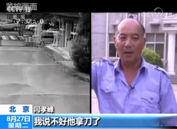 见杨某已经离开,两名保安继续站在门口迎接前来上班的员工。由于之前于世生还打电话报了警,7点31分,于世生接到警方电话,询问之前报警的情况。而此时,站在门外的闫孝峰突然发现杨某又气势汹汹朝他们走来,手里居然还挥舞着一把菜刀。