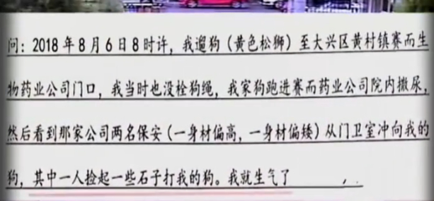 根据杨某的询问笔录来看,当时因为他看到闫孝峰捡起石子打他的狗,于是骂了一句,在保安室的于世生闻声走了出来,三人起了冲突。此时,那只惹事的松狮犬已经从树丛里跑到了门口,三人的冲突却没有停止,而是从口角升级到了互相推搡。