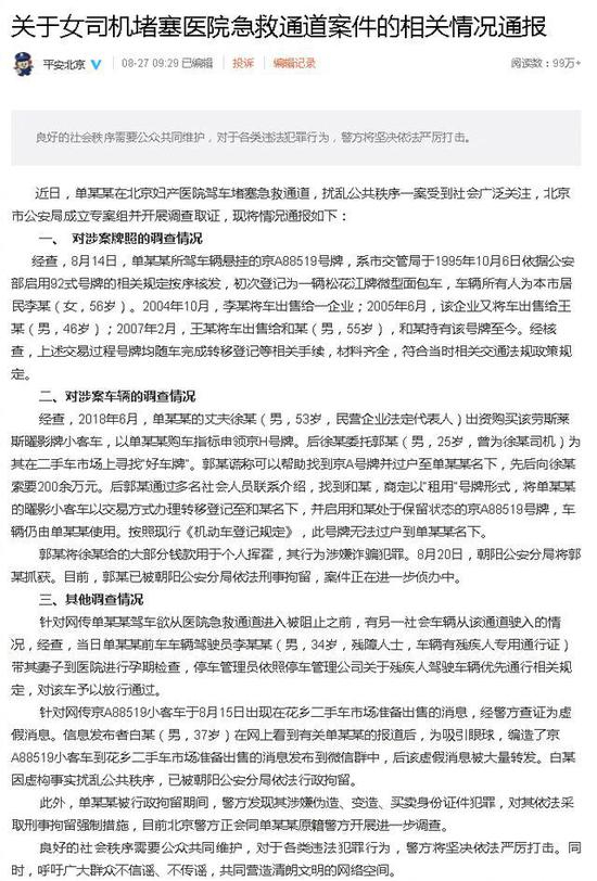 刚刚,北京市公安局通报,驾驶劳斯劳斯轿车堵塞北京妇产医院急救通道的女司机单某某,已被依法采取刑事拘留强制措施,原因是在其行政拘留期间,警方发现其涉嫌伪造、变造、买卖身份证件犯罪。