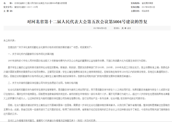 此前,曾为全国人大代表的朱立秋曾提出“关于深化高校后勤社会化服务价格形成机制改革的建议”,该建议遭到否决。河北省发改委在答复朱立秋建议时明确表示:
