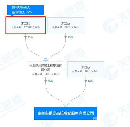 荔枝新闻通过“天眼查”查询到,秦皇岛鹏远高校后勤服务有限公司成立于2003年,注册资本为1000万元人民币,法定代表人为朱立秋,持有该公司90%的股份。