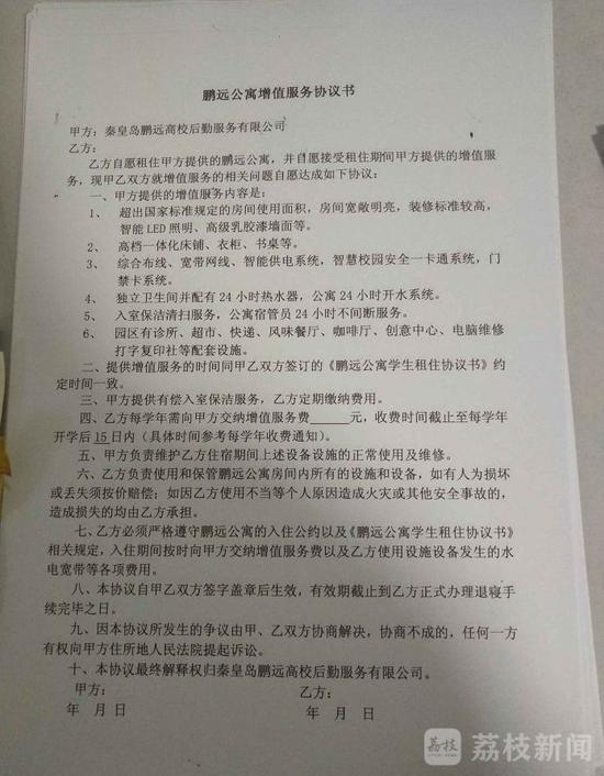 那么,收取高额服务费是否合理?不同的档位服务的差别在哪里?该校学生向荔枝新闻表示,“虽然六人间的服务费是300元,豪华两人间的服务费是14000多元;但是两个服务费在服务上是打等号的”。秦皇岛鹏远高校后勤服务有限公司则向荔枝新闻回应道,服务费不同因房间内设施不同。荔枝新闻在鹏远后勤服务公司与学生签订的合同中看到,增值服务包含:超出国家标准规定的房间使用面积;高档一体化床铺、衣柜、书桌;门禁卡系统等。