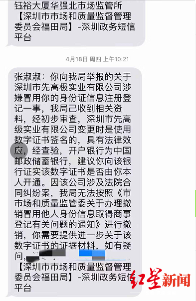 张淑淑称,今年4月,她要求深圳市市场监管局注销其名下公司,得到回复称因公司变更时使用的是数字证书签名,具有法律效力,同时公司涉及合同纠纷无法撤销。