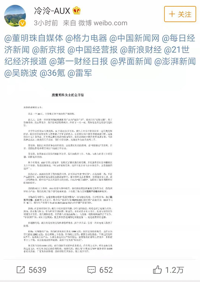 8月30日,奥克斯家电事业部总裁冷冷在微博上发表《致董明珠女士的公开信》,并@董明珠自媒体和格力电器等官方微博号。公开信表示奥克斯将于9月2日提供格力空调能效不合格的拆解视频,以便帮助其修正这些错误认识。