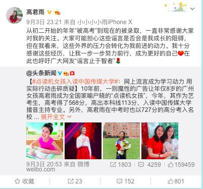 此前,高君雨在其微博上分享过一段自白FM,回应了关于高考成绩的种种传言和艺考的感想。
