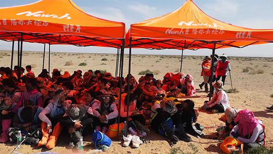 下午3点半不到,高奇到达营地。这是戈壁滩中的一块平地,几个简易的大遮阴棚下,1000多个学生们挤挤挨挨地坐在地上休息。有人找不到地方乘凉,就靠在车辆的阴影下借一丝阴凉。