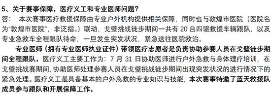 戈壁环境特殊,父母起初不同意,她把资料文件都拿给他们看——参赛学生曾收到一份《组委会应部分参赛者问题统一回复》,显示医疗保障齐全,救援车、专业医生、蓝天救援队成员都在跟队保障之列。