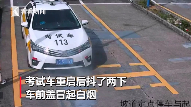 原来,补考开始后,田女士重新启动车辆,松开一半离合器后又猛加油,再加上忘了放手刹,导致发动机转数过高,温度过热,车前盖冒起了白烟。