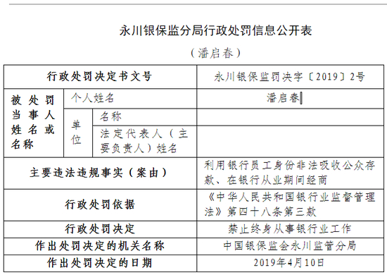 今年4月,银保监会永川监管分局就某银行职员潘启春因利用银行员工身份非法吸收公众存款、在银行从业期间经商对该人员作出禁止终身从事银行业工作的处罚。