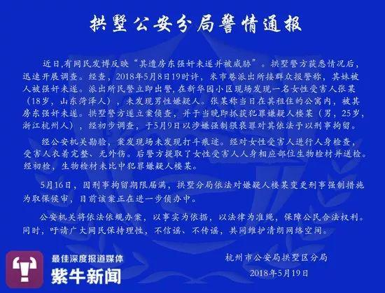 2018年5月19日,杭州市公安局拱墅区分局针对这一事件发布警情通报:案发现场未发现打斗痕迹。经对女性受害人进行人身检查,受害人衣着完整、无明显外伤。后警方提取了女性受害人人身相应部位生物检材并送检。经初检,未比中犯罪嫌疑人楼某。5月16日,因刑事拘留期限届满,拱墅区分局依法对嫌疑人楼某变更刑事强制措施为取保候审。