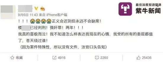 “正义会迟到但永远不会缺席!楼某已经判刑!强奸罪!两年!!!我真的喜极而泣!我不知道怎么样表达我现在的心情,我受的所有的委屈都值了。”接完电话后,小婷忍不住在微博上与大家分享这个消息。