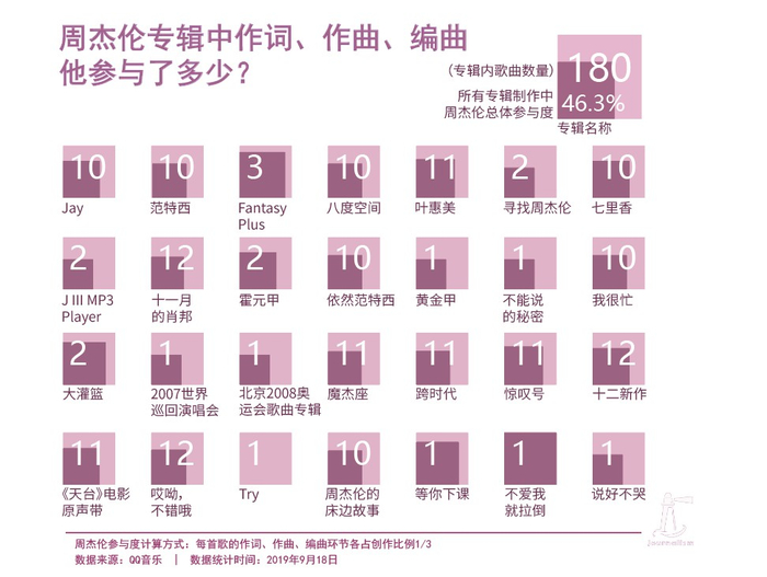 这一部分,我们手动统计了上述19张专辑、6首单曲和3部电影原声带中的作词、作曲、编曲情况,记录其中周杰伦的参与情况的比重。