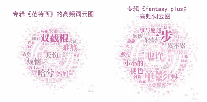 从词频来看,《范特西》《Fantasy Plus》的词汇运用上超脱于情爱,主题多变,展现出周杰伦对于世界、历史与自我的奇思妙想。这两张专辑的词语趣味性强,既有“美索不达米亚”“威廉古堡”等不常用的名词,又有“吆嗷”“哼哼哈兮”等口语化词语,极具周杰伦的个人风格。修辞也十分丰富,如比喻手法、情景描写等。《范特西》专辑中出现最高频的词语是“双截棍”。“双截棍”与排名第二的“哈兮”均出自周杰伦的成名曲《双截棍》。“双截棍”一度成为热词,传唱度较高。诸如“哼哼哈兮”“飞檐走壁”等词语迎合旋律反复出现,加深了人们对“周杰伦”的印象刻画。