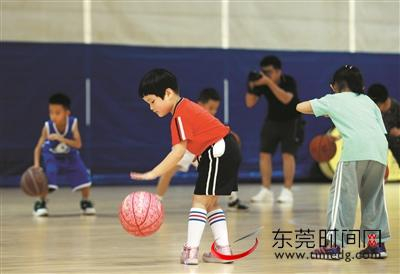 ▲小朋友们跟着老师学打篮球