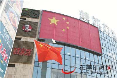 在南城蜂汇广场,记者看到了更为震撼的一幕:一面巨大鲜艳的五星红旗,贴挂在了蜂汇广场楼宇的正面,在阳光的照耀下,熠熠生辉。蜂汇广场商场的停车场门口附近,也挂起了很多面五星红旗。