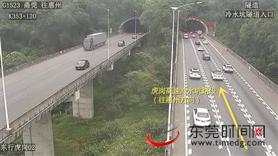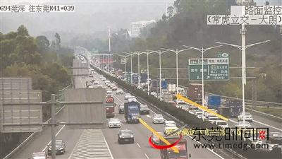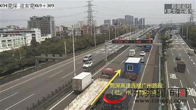 广深高速公路K53至K56路段(广深高速公路与广龙高速公路番莞段一期互通立交段)。广深高速公路上行驶的车辆转向广龙高速公路番莞段一期(或者广龙高速公路番莞段一期上行驶的车辆转向广深高速公路)时,易发生拥堵。