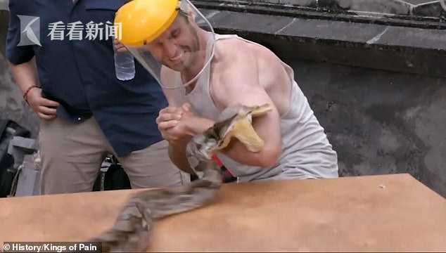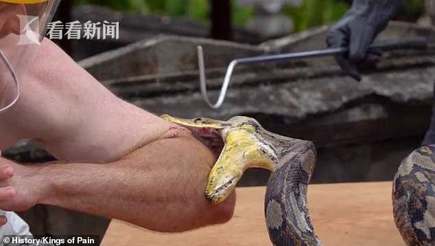 肖恩将结实的胳膊肘伸到蟒蛇跟前,蟒蛇迅猛地一口咬上去,感觉到面前的“猎物”巨大,蟒蛇继续将嘴巴张到极限,锋利的大牙狠狠咬进肖恩的胳膊肘,肖恩疼得大叫起来。就在蟒蛇准备使出杀招,用庞大的身躯卷住“猎物”将其勒死的时候,搭档艾利瓦和工作人员赶紧将蟒蛇挪开。
