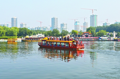 “开船喽!”首批3艘游船从二号码头启航,运河游正式开启。伴随着鸣笛声,古色古香的游船缓缓从二号码头向北,往前方的玉带河大桥驶去。站在船顶的观光台上,视野非常宽阔,平均200米宽的运河河道和沿岸的高楼、公园林地一览无余。水面清亮,迎风闻不到一丝异味儿。时不时能看见有市民在河岸边垂钓。