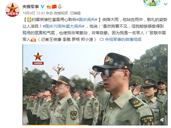 突降大雨,他站在雨中,敬礼的姿势让人泪目!国庆70周年盛大阅兵,他说:“虽然我看不见,但我能够感受得到现场的氛围和气氛,也使我非常激动,非常自豪。因为我是一名军人!”致敬中国军人。(记者王俊康 李鹏 罗杨 郑小涛)
