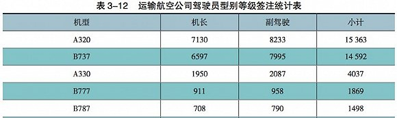 中国航空公司目前采用的执飞机型以空客和波音飞机为主。比较常见的机型有窄体客机空客A320、波音737;宽体机空客A330、波音787等。统计显示,中国运输航空公司驾驶员中,A320飞机的机长数量最多,达到7130人,波音737紧随其后,达到6597人。