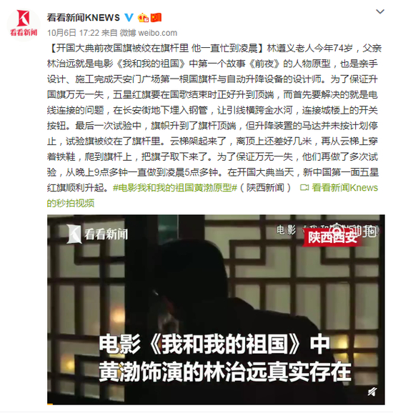 林遵义老人今年74岁,父亲林治远就是电影《我和我的祖国》中第一个故事《前夜》的人物原型,也是亲手设计、施工完成天安门广场第一根国旗杆与自动升降设备的设计师。为了保证升国旗万无一失,五星红旗要在国歌结束时正好升到顶端,而首先要解决的就是电线连接的问题,在长安街地下埋入钢管,让引线横跨金水河,连接城楼上的开关按钮。最后一次试验中,旗帜升到了旗杆顶端,但升降装置的马达并未按计划停止,试验旗被绞在了旗杆里。云梯架起来了,离顶上还差好几米,再从云梯上穿着铁鞋,爬到旗杆上,把旗子取下来了。为了保证万无一失,他们再做了多次试验,从晚上9点多钟一直做到凌晨5点多钟。在开国大典当天,新中国第一面五星红旗顺利升起。