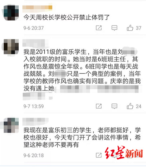 红星新闻记者发现,卢某某发布微博后,也引来了很多人的评论,且大部分是富乐中学曾经的学生,很多人在诉说着老师的不是,也有评论称是“卢某某太调皮,家长要找一个严格的老师来管住他”。还有人称刘老师教学好,没有遇到过这种情况。