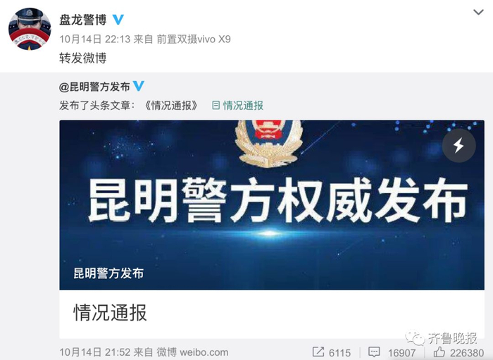10月14日晚,昆明警方微博通报李某草死亡事件最新调查进展。