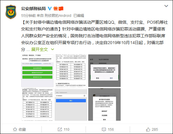 通告称,针对中缅边境地区电信网络诈骗犯罪活动猖獗、严重侵害人民群众财产安全的情况,国务院打击治理电信网络新型违法犯罪工作部际联席会议办公室正在组织开展专项打击行动,决定自2019年10月14日起,对缅北部分电信网络诈骗活动严重区域的QQ、微信、支付宝、POS机等社交和支付账户采取封停措施。如有疑问,请尽快联系公安部驻云南普洱工作站,公安机关将快速甄别,对因技术原因误关停的账号予以解封。通告公开了14个公安部驻云南普洱工作站联系电话。