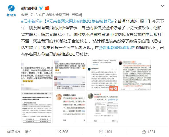 四川成都的夏先生最近在昭通工作,夏先生怎么也想不通,自己用四川电信号码绑定的微信被莫名封号,封号后还要到普洱网警那里申诉。 “我压根没去过普洱。11点多被封的微信号,显示存在欺诈,不可解封。之后联系普洱公安局告知我们打087996100,电话连续打了进一小时,提供的申诉电话始终占线。”
