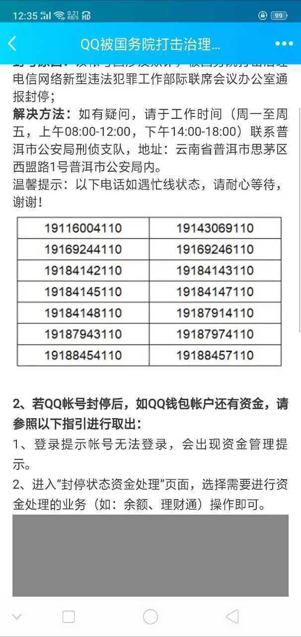 该提示还提供了解决方法,称如有疑问,请联系普洱市公安局刑侦支队,并附上地址和14个联系电话。有网友就此表示,封号后普洱刑侦支队所有公布的电话都打不通,就连普洱的110都处于全忙状态,“估计都是被突然停了微信号的用户把电话打爆了!”