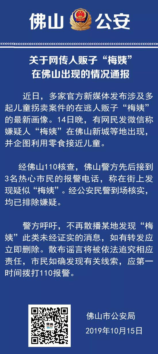 昨天下午,佛山公安对网传人贩子“梅姨”在佛山出现的情况进行通报。