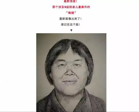 2017年6月,广州增城警方发布了一则通告,对一名叫“梅姨”的女子征集线索。通告称,“梅姨”,真实姓名不详,现约65岁,身高1.5米,讲粤语,会客家话,曾长期在增城、韶关新丰等地区活动,涉嫌多起儿童拐卖案件。警方在发布的征集线索通告中,还贴出了一张“梅姨”的模拟画像。