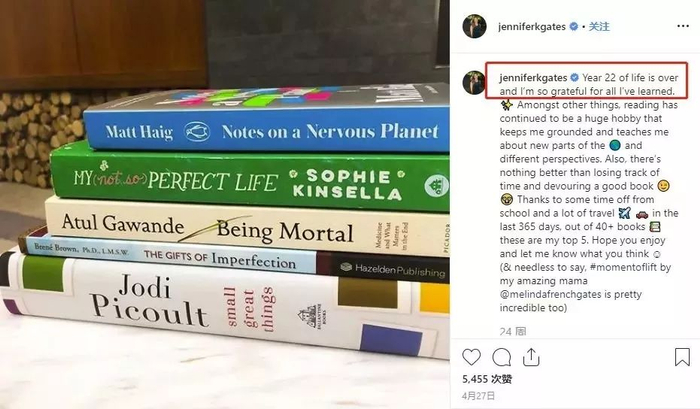 父母的言传身教让詹妮弗受益匪浅。去年生日时,她在社交网站分享的不是生日礼物,而是一年读过的40本书里最推荐的5本。