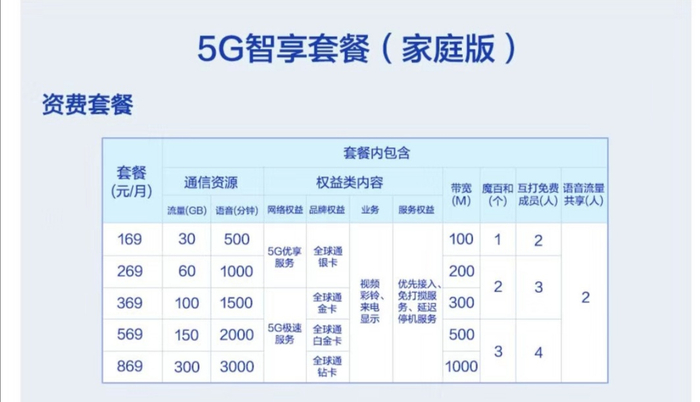 此外,中国移动推出5G套餐家庭版,家庭版每月分169元、269元、369元、569元、869元五个档,流量从30GB到300GB不等。根据套餐资费,宽带速度从100M到1000M不等。