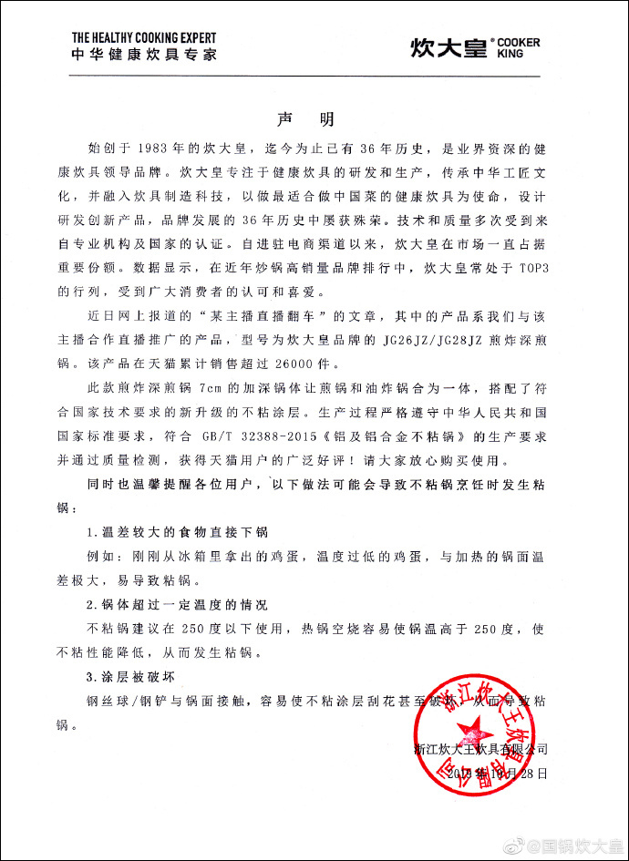 对此,浙江炊大王炊具有限公司官方微博@国锅炊大皇 10月29日回应称,李佳琦直播中的产品是该公司与其合作推广的一款煎炸深煎锅,该产品搭配不粘图层,符合生产要求并通过质量检测。