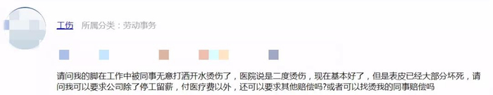 请问,我的脚在工作中被同事无意打洒的开水烫伤了,医院说是二度烫伤,现在基本好了,但是表皮已经大部分坏死。请问我除了要求公司停工留薪,付医疗费以外,还可以要求其他赔偿吗?或者可以找烫伤我的同事赔偿吗?