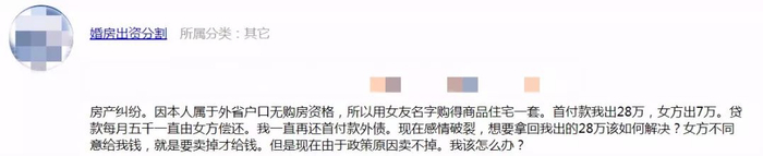 因本人属于外省户口无购房资格,所以用女友名字购得商品住宅一套。首付款我出28万,女方出7万。贷款每月5000一直由女方偿还,我一直在还首付款外债。现在感情破裂,我想要拿回我出的28万该如何解决?女方不同意给我钱,就是要卖掉房子才给钱,但是现在由于政策原因卖不掉。我该怎么办?