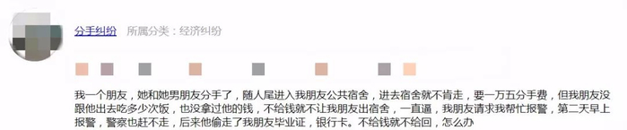 最后,以上是双方因感情问题而引发的纠纷,为避免矛盾进一步激化,建议双方还是积极协商解决。如果协商无果,男方仍继续采取威胁手段索要分手费,建议你及时保存相关证据如聊天记录等,然后报警解决处理。