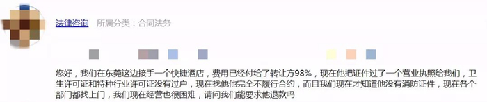 您好,我们在东莞这边接手一个快捷酒店,费用已经付给了转让方98%,现在他把证件过了一个营业执照给我们,卫生许可证和特种行业许可证没有过户。现在找他,他完全不履行合约,而且我们现在才知道他没有消防证件,现在各个部门都找上门,我们现在经营也很困难,请问我们能要求他退款吗?