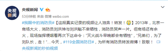 2013年,北京一商场大火,消防员刘洪坤与刘洪魁不幸牺牲,消防员哭声一片。但商场还有余火,现场指挥哽咽着再次下达命令:“灭火战斗早晚都会有牺牲”,“兄弟们,为了刘队长,走!”…今天,119全国消防日,为所有消防员转发微博!致敬!