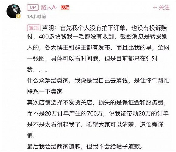 而“路人A-”此前于11月6日曾在个人B站动态中道歉,并愿意承担重开店铺的费用。不过,他同时发布了一份声明称,“我个人并没有拍下订单,也没有收到400多块钱的赔付,我用的图也是别人的,但全网都在针对我。”并提出,店铺不发货关店,损失的也不是20万订单产生的700万费用,只是保证金和服务费而已。